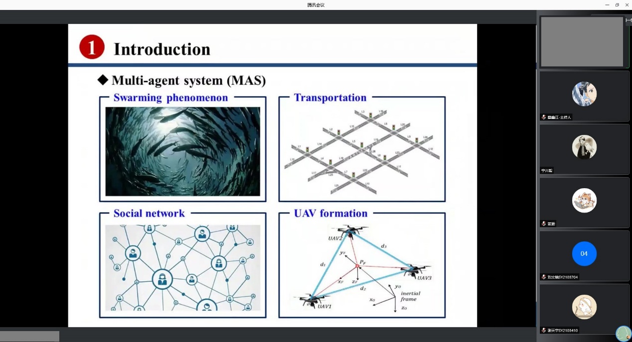 接下来进行分享的是贝博艾弗森代言体育官网2018级博士生张璟尧同学。他以“非线性多智能体网络系统在切换拓扑下的分布式迭代学习控制”为题,整合其发表在AUTOMATICA和IEEE TAC上的两篇论文研究内容进行汇报。张璟尧同学首先简要介绍了迭代学习控制的基本原理与优缺点,并以行进乐队为例,对迭代学习控制的对象——多智能体系统的相关特点与控制目标进行了阐述。随后引入代数图论、联合生成树等知识,设计分布式迭代学习控制协议,将全局Lipschitz条件放松为局部Lipschitz条件,通过理论推导、数值仿真等手段,回答了在具有切换拓扑的非线性多智能体网络系统中如何实现分布式迭代学习控制这一问题。