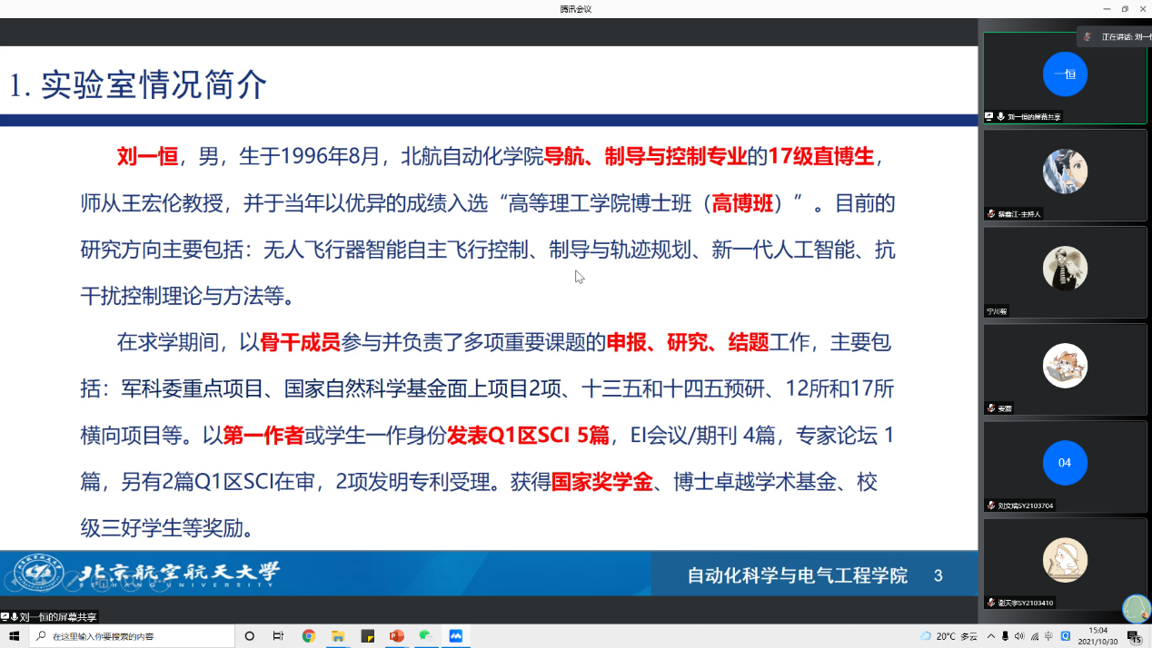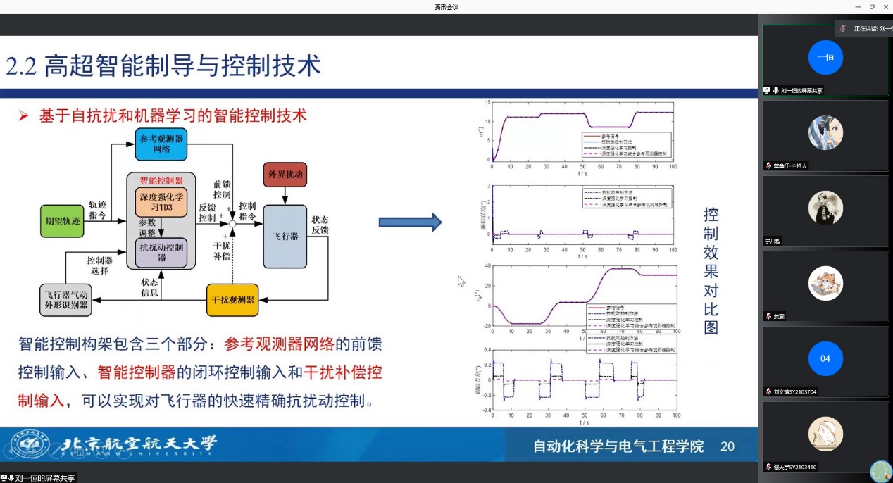 刘一恒同学是贝博艾弗森代言体育官网2017级博士研究生,师从王宏伦教授。汇报开始,刘一恒同学简要介绍了个人信息与课题组概况,随后围绕“无人机软式空中对接与回收抗扰动快速精准控制技术研究”,从“无人机空中对接与回收控制”、“高超智能制导与控制技术”、“无人机自主空中加油对接控制技术”、“飞行器空中态势感知与自主避撞技术”、“运载火箭上面级智能在线重规划技术”五个方面展开介绍,明确阐述了研究工作的重要性与难点,并通过大量图表、仿真结果、实验结果,直观地展示了其在博士期间丰富的科研成果。最后,刘一恒同学分享了自己在多年科研生活中总结出的宝贵经验,强调了明确研究方向、提前做好未来发展规划的重要性,分析了项目与科研的互补作用,也叮嘱大家要注意身体、健康生活。